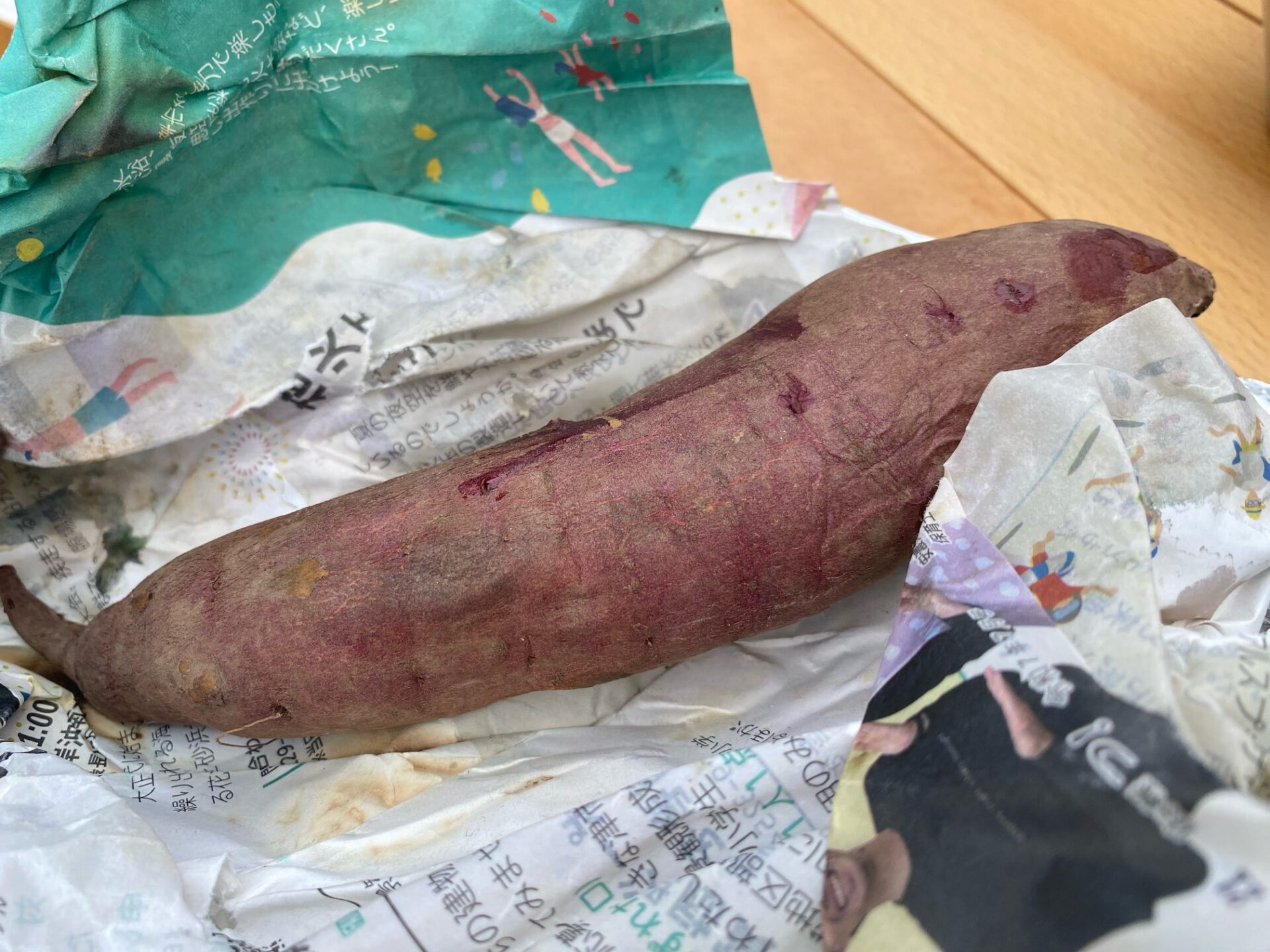 新聞紙を軽く水で湿らせて、さつまいもを包みます。